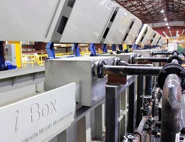 The iBox has immersion boxes inside through which strips travel guided by rolls and skids. This pickling process uses the strong shear flow generated by the narrow and rectangular channel the immersion boxes form to accelerate the acid-liquid reaction without an electric pump required to circulate the acid solution in conventional jet pickling tanks.